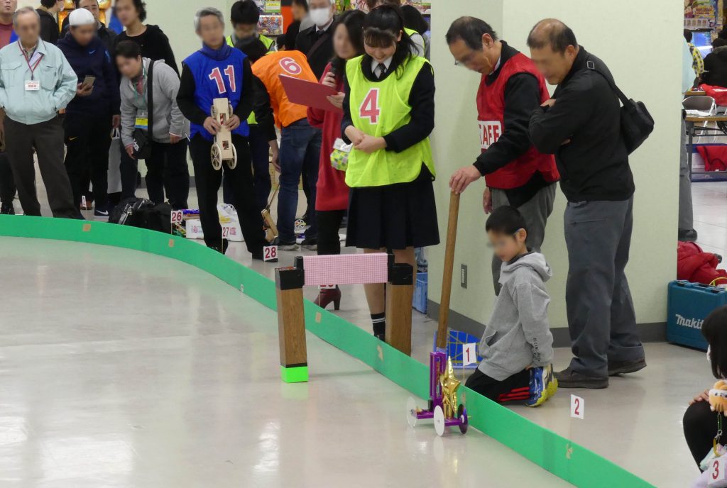 また同会場で開催された鈴鹿市主催「第6回すずか輪ゴムグランプリ」(輪ゴム24本の動力のみで自作車の走行距離を競う)では、本校から6チームが参戦しました。残念ながら優勝は逃しましたが、専攻科2年の森川智裕さんが記録1224mで第2位、専攻科2年の田中亨弥さんが記録1104.25mで第3位と、他多数の車の10倍以上の大記録を残しました。