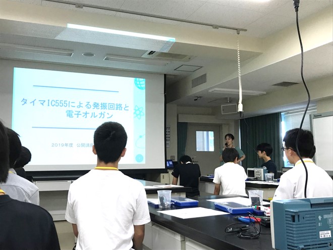 受講生のみなさんは、「タイマIC555を使った電子ピアノの作製」をテーマに、オリジナルの回路基板にハンダゴテを使ってパーツを取り付け、音の調律を行い、電子ピアノを作製しました。電子工作を通して、電子回路の基礎知識や電子ピアノの原理、電気信号と音階の関係について実践的に学ぶことができました。作製した電子ピアノはお土産としてお持ち帰りいただきました。