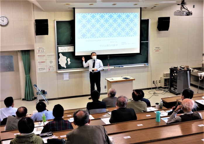 今回は、教養教育科の大貫洋介准教授が「タイル張りの数字」と題し講演を行いました。同じ大きさ・形のタイルで平面を敷き詰めるために、どのような形であることが必要なのかという話題から発展させ、変わった形状のタイルで平面を敷き詰める考え方について解説しました。