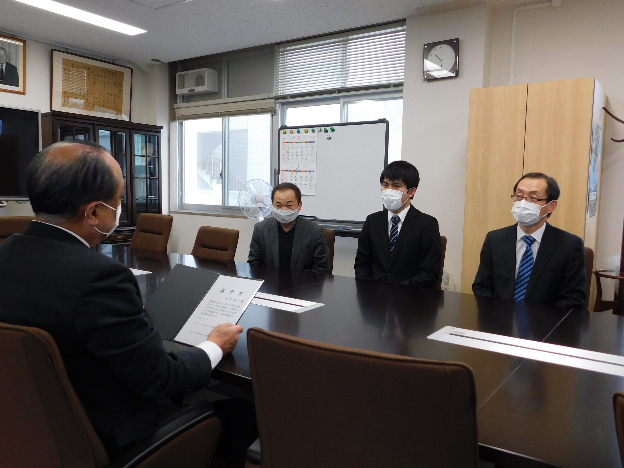 3月8日(月)に、専攻科長の田添教授、材料工学科長の和田教授、特別研究指導教員の兼松教授とともに、竹茂校長に研究内容の説明と受賞の報告をしました。