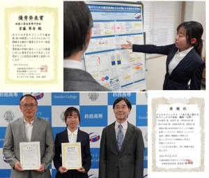 学生は、特別研究や卒業研究の参考となるフォトセラミックスのセッションの講演を中心に聴講しました。また、専攻科1年の首藤琴音さんは、ポスター発表「リン酸塩ガラス中の賦活助剤となる欠陥とその蛍光分光特性,(鈴鹿高専) 首藤琴音・和田憲幸・(三重県工業研究所) 井上幸司」にて優秀発表賞を受賞しました。当日の朝からとても緊張していましたが、直前にもポスター会場で発表の練習をした甲斐もあり、受賞することができました。