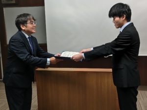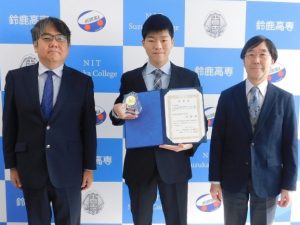 1月29日(木)、令和8年度表面技術協会中部支部総会にて他の2名の受賞者とともに授賞式が執り行われ、2月4日(水)に、指導教員の生物応用化学科平井教授とともに校長へ受賞報告を行いました。