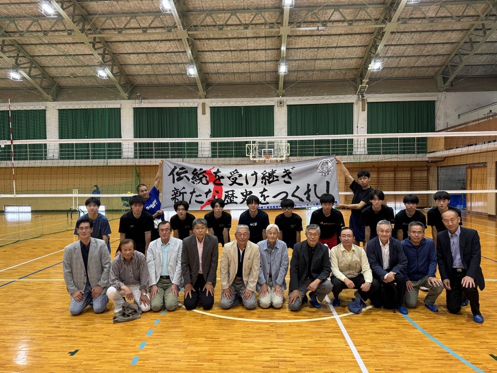 OB会から横断幕の寄贈 本校バレー部の卒業生でもあり,生物応用化学科で教鞭を執られていた澤田善秋先生が音頭をとってくださり,OBから現役性の激励として横断幕を寄贈していただきました.寄贈の際は,「全国高専大会4連覇目指して頑張ってください」と激励の言葉も頂き,現役生はより一層士気が高まりました.寄贈頂きました横断幕は月末に開催される高校総体から会場に掲示します. OBの皆さま,ありがとうございます!
